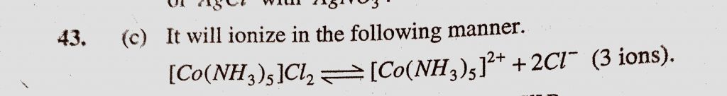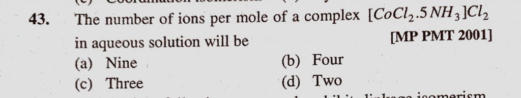 The number of ions per mole of complex (CoCl2.5NH3)Cl2 in aqueous solution will be (a) Nine (b) Four (c) Three (d) Two The number of ions per mole of complex (CoCl2.5NH3)Cl2 in aqueous solution will be (a) Nine (b) Four (c) Three (d) Two December 4, 2020 Category: Uncategorised (JEE Advanced Physics by BM Sharma + GMP Solutions) , Facebook Messenger WhatsApp Share this:TwitterFacebook Related