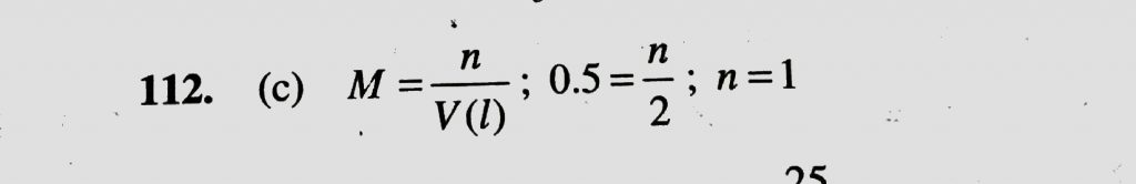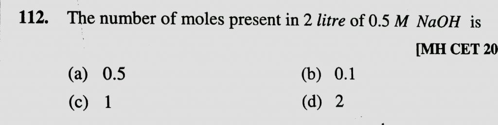 The number of moles present in 2 litre of 0.5 M NaOH is (a) 0.5 (b) 0.1 (c) 1 (d) 2 The number of moles present in 2 litre of 0.5 M NaOH is (a) 0.5 (b) 0.1 (c) 1 (d) 2 December 11, 2020 Category: Uncategorised (JEE Advanced Physics by BM Sharma + GMP Solutions) , Facebook Messenger WhatsApp Share this:TwitterFacebook Related