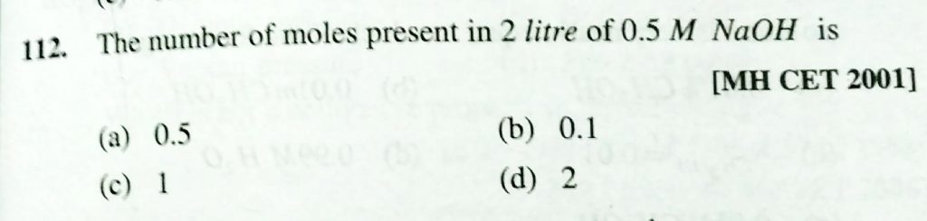 The number of moles present in 2litre of 0.5 M NaOH is (a) 0.5 (b) 0.1 (c) 1 (d) 2 The number of moles present in 2litre of 0.5 M NaOH is (a) 0.5 (b) 0.1 (c) 1 (d) 2 December 11, 2020 Category: Uncategorised (JEE Advanced Physics by BM Sharma + GMP Solutions) , Facebook Messenger WhatsApp Share this:TwitterFacebook Related