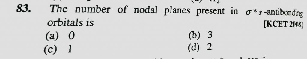 The number of nodal planes present in sigma * s – antibonding orbitals is (a) 0 (b) 3 (c) 1 (d) 2 The number of nodal planes present in sigma * s - antibonding orbitals is (a) 0 (b) 3 (c) 1 (d) 2 December 8, 2020 Category: Uncategorised (JEE Advanced Physics by BM Sharma + GMP Solutions) , Facebook Messenger WhatsApp Share this:TwitterFacebook Related