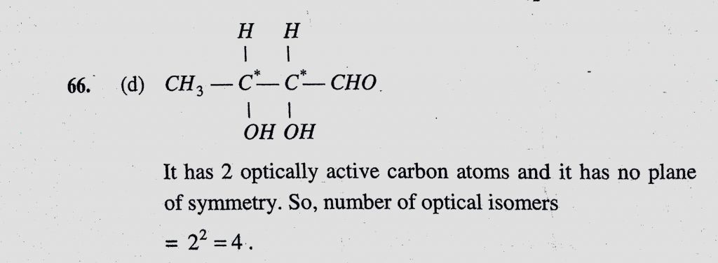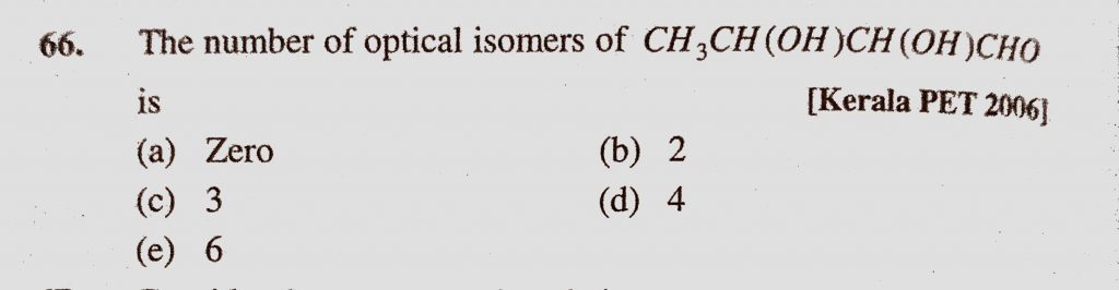 The number of optical isomers of CH3CH(OH)CH(OH)CHO is (a) Zero (b) 2 (c) 3 (d) 4 (e) 6 The number of optical isomers of CH3CH(OH)CH(OH)CHO is (a) Zero (b) 2 (c) 3 (d) 4 (e) 6 December 10, 2020 Category: Uncategorised (JEE Advanced Physics by BM Sharma + GMP Solutions) , Facebook Messenger WhatsApp Share this:TwitterFacebook Related