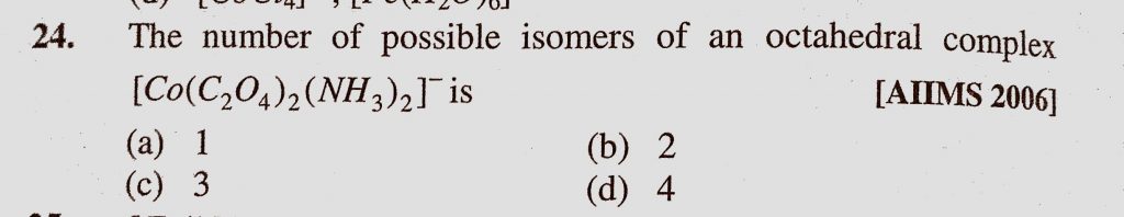 The number of possible isomers of an octahedral complex (Co(C2O4)2(NH3)2)- is (a) 1 (b) 2 (c) 3 (d) 4 The number of possible isomers of an oxtahedral complex (Co(C2O4)2(NH3)2)- is (a) 1 (b) 2 (c) 3 (d) 4 December 4, 2020 Category: Uncategorised (JEE Advanced Physics by BM Sharma + GMP Solutions) , Facebook Messenger WhatsApp Share this:TwitterFacebook Related