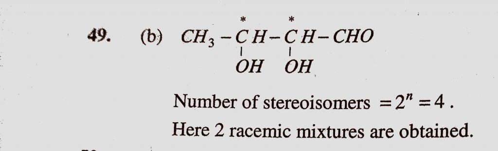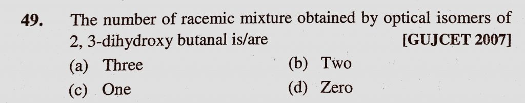 The number of racemic mixture obtained by optical isomers of 2,3 -dihydroxy butanal is / are (a) Three (b) Two (c) One (d) Zero 3 -dihydroxy butanal is / are (a) Three (b) Two (c) One (d) Zero The number of racemic mixture obtained by optical isomers of 2 December 10, 2020 Category: Uncategorised (JEE Advanced Physics by BM Sharma + GMP Solutions) , Facebook Messenger WhatsApp Share this:TwitterFacebook Related