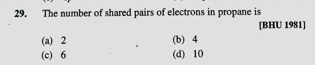 The number of shared pairs of electrons in propane is (a) 2 (b) 4 (c) 6 (d) 10 The number of shared pairs of electrons in propane is (a) 2 (b) 4 (c) 6 (d) 10 December 6, 2020 Category: Uncategorised (JEE Advanced Physics by BM Sharma + GMP Solutions) , Facebook Messenger WhatsApp Share this:TwitterFacebook Related