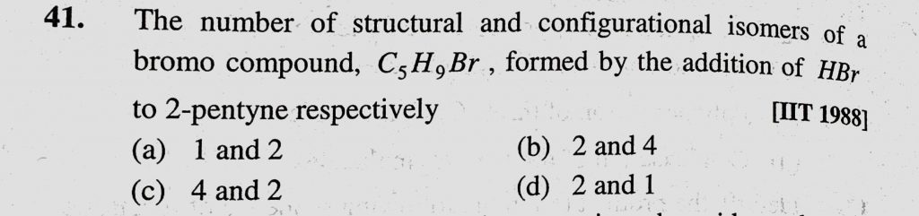 The number of structural and configurational isomers of a bromo compound, C5H9Br, formed by the addition of HBr to 2-pentyne respectively C5H9Br formed by the addition of HBr to 2-pentyne respectively The number of structural and configurational isomers of a bromo compound December 16, 2020 Category: Uncategorised (JEE Advanced Physics by BM Sharma + GMP Solutions) , Facebook Messenger WhatsApp Share this:TwitterFacebook Related