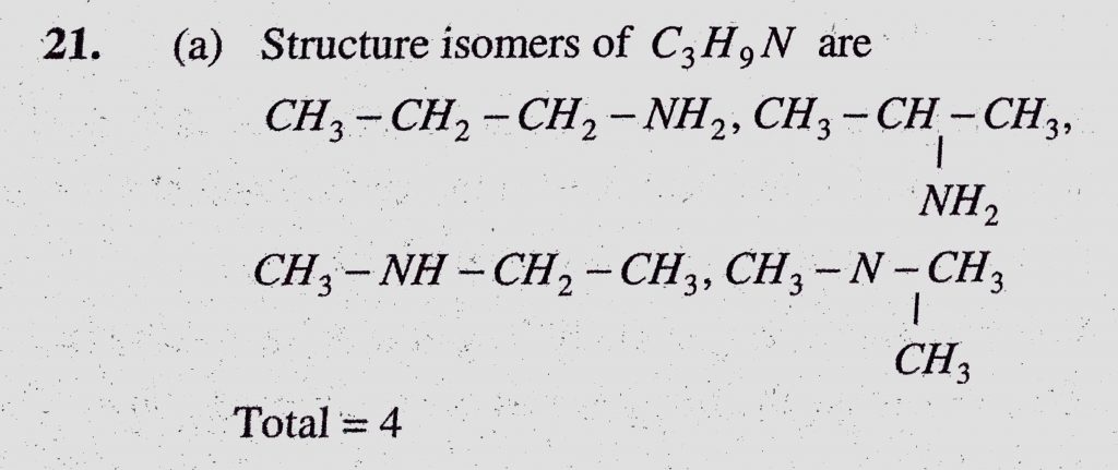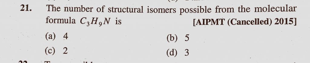 The number of structural isomers possible from the molecular formula C3H9N is (a) 4 (b) 5 (c) 2 (d) 3 The number of structural isomers possible from the molecular formula C3H9N is (a) 4 (b) 5 (c) 2 (d) 3 December 10, 2020 Category: Uncategorised (JEE Advanced Physics by BM Sharma + GMP Solutions) , Facebook Messenger WhatsApp Share this:TwitterFacebook Related