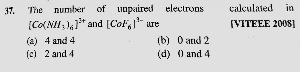 The number of unpaired electrons calculated in (Co(NH3)6) 3+ and (CoF6) 3- are (a) 4 and 4 (b) 0 and 2 The number of unpaired electrons calculated in (Co(NH3)6) 3+ and (CoF6) 3- are (a) 4 and 4 (b) 0 and 2 December 4, 2020 Category: Uncategorised (JEE Advanced Physics by BM Sharma + GMP Solutions) , Facebook Messenger WhatsApp Share this:TwitterFacebook Related
