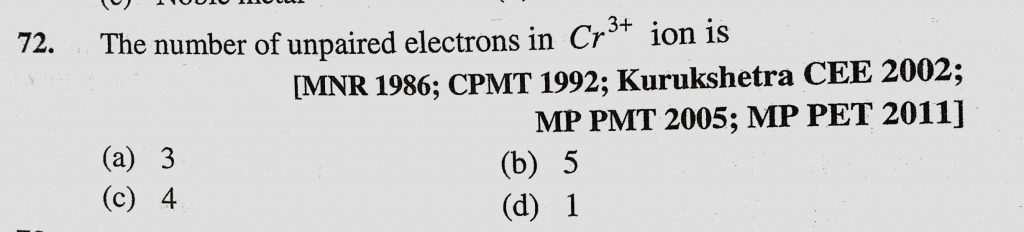 The number of unpaired electrons in Cr 3+ ion is (a) 3 (b) 5 (c) 4 (d) 1 The number of unpaired electrons in Cr 3+ ion is (a) 3 (b) 5 (c) 4 (d) 1 November 30, 2020 Category: Uncategorised (JEE Advanced Physics by BM Sharma + GMP Solutions) , Facebook Messenger WhatsApp Share this:TwitterFacebook Related