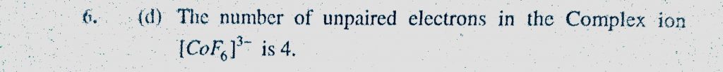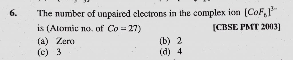 The number of unpaired electrons in the complex ion (COF6) 3- is (Atomic no. of Co = 27) (a) Zero (b) 2 (c) 3 (d) 4 The number of unpaired electrons in the complex ion (COF6) 3- is (Atomic no. of Co = 27) (a) Zero (b) 2 (c) 3 (d) 4 December 4, 2020 Category: Uncategorised (JEE Advanced Physics by BM Sharma + GMP Solutions) , Facebook Messenger WhatsApp Share this:TwitterFacebook Related