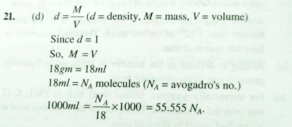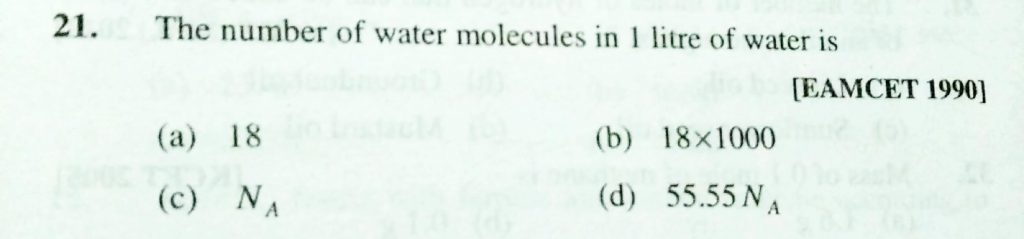 The number of water molecules in 1 litre of water is (a) 18 (b) 18 x 1000 (c) Na (d) 55.55 Na The number of water molecules in 1 litre of water is (a) 18 (b) 18 x 1000 (c) Na (d) 55.55 Na November 22, 2020 Category: Uncategorised (JEE Advanced Physics by BM Sharma + GMP Solutions) , Facebook Messenger WhatsApp Share this:TwitterFacebook Related