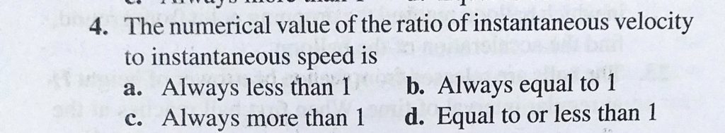 The numerical value of the ratio of instantaneous velocity to instantaneous speed is a. Always less than 1 b. Always equal to 1 c. Always more than 1 d. Equal to or less than 1 The numerical value of the ratio of instantaneous velocity to instantaneous speed is a. Always less than 1 b. Always equal to 1 c. Always more than 1 d. Equal to or less than 1 September 19, 2020 Category: Uncategorised (JEE Advanced Physics by BM Sharma + GMP Solutions) , Facebook Messenger WhatsApp Share this:TwitterFacebook Related