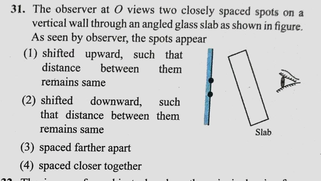 The observer at O views closely spaced spots on a vertical wall through an angled glass slab as shown in figure. As seen by observer, the spots appear (1) shifted upward, such that distance between them such that distance between them The observer at O views closely spaced spots on a vertical wall through an angled glass slab as shown in figure. As seen by observer the spots appear (1) shifted upward October 6, 2020 Category: Uncategorised (JEE Advanced Physics by BM Sharma + GMP Solutions) , Facebook Messenger WhatsApp Share this:TwitterFacebook Related