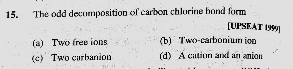 The odd decomposition of carbon chlorine bond form (a) Two free ions (b) Two-carbonium ion (c) Two carbanion (d) A cation and an anion The odd decomposition of carbon chlorine bond form (a) Two free ions (b) Two-carbonium ion (c) Two carbanion (d) A cation and an anion February 9, 2021 Category: Uncategorised (JEE Advanced Physics by BM Sharma + GMP Solutions) , Facebook Messenger WhatsApp Share this:TwitterFacebook Related
