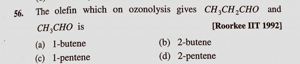 The olefin which on ozonolysis gives CH3CH2CHO and CH3CHO is (a) 1-butene (b) 2-butene (c) 1-pentene (d) 2-pentene The olefin which on ozonolysis gives CH3CH2CHO and CH3CHO is (a) 1-butene (b) 2-butene (c) 1-pentene (d) 2-pentene December 16, 2020 Category: Uncategorised (JEE Advanced Physics by BM Sharma + GMP Solutions) , Facebook Messenger WhatsApp Share this:TwitterFacebook Related