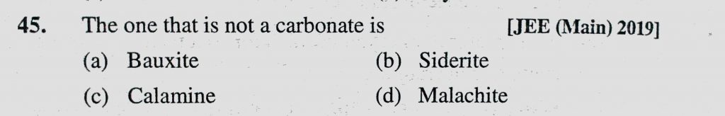 The one that is not a carbonate is (a) Bauxite (b) Siderite (c) Calamine (d) Malachite The one that is not a carbonate is (a) Bauxite (b) Siderite (c) Calamine (d) Malachite November 12, 2020 Category: Uncategorised (JEE Advanced Physics by BM Sharma + GMP Solutions) , Facebook Messenger WhatsApp Share this:TwitterFacebook Related