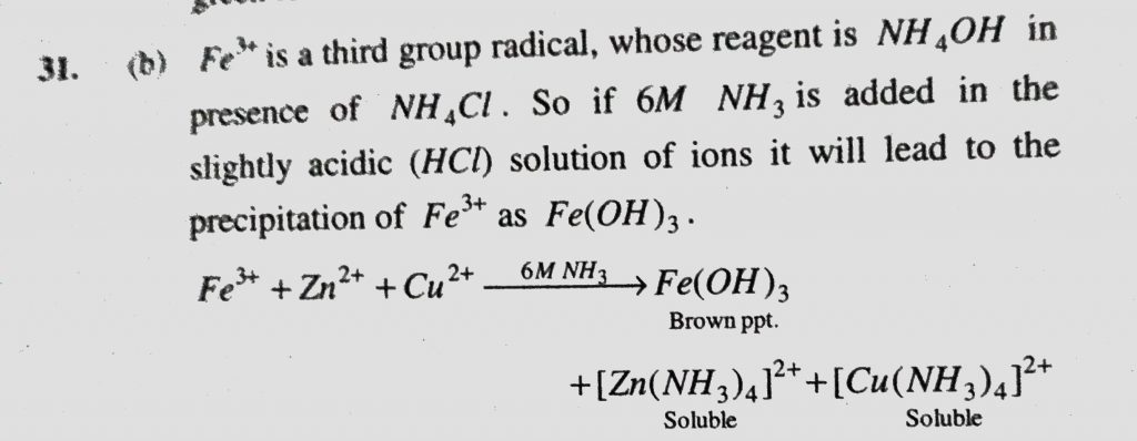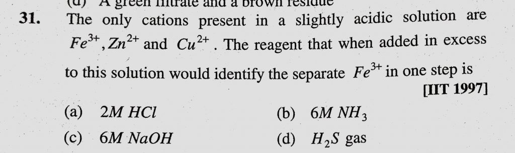 The only cations present in a slightly acidic solution are Fe 3+, Zn 2+ and Cu 2+. The reagent that when added in excess to this solution would identify the separate Fe 3+ in one step is The only cations present in a slightly acidic solution are Fe 3+ Zn 2+ and Cu 2+. The reagent that when added in excess to this solution would identify the separate Fe 3+ in one step is December 8, 2020 Category: Uncategorised (JEE Advanced Physics by BM Sharma + GMP Solutions) , Facebook Messenger WhatsApp Share this:TwitterFacebook Related