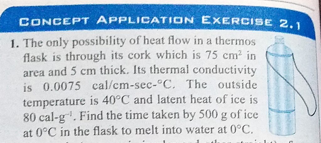 The only possibility of heat flow in a thermos flask is through its cork which is 75 cm^2 in area and 5 cm thick. Its thermal conductivity is 0.0075 cal/cm-sec-C. The outside The only possibility of heat flow in a thermos flask is through its cork which is 75 cm^2 in area and 5 cm thick. Its thermal conductivity is 0.0075 cal/cm-sec-C. The outside October 24, 2020 Category: Uncategorised (JEE Advanced Physics by BM Sharma + GMP Solutions) , Facebook Messenger WhatsApp Share this:TwitterFacebook Related