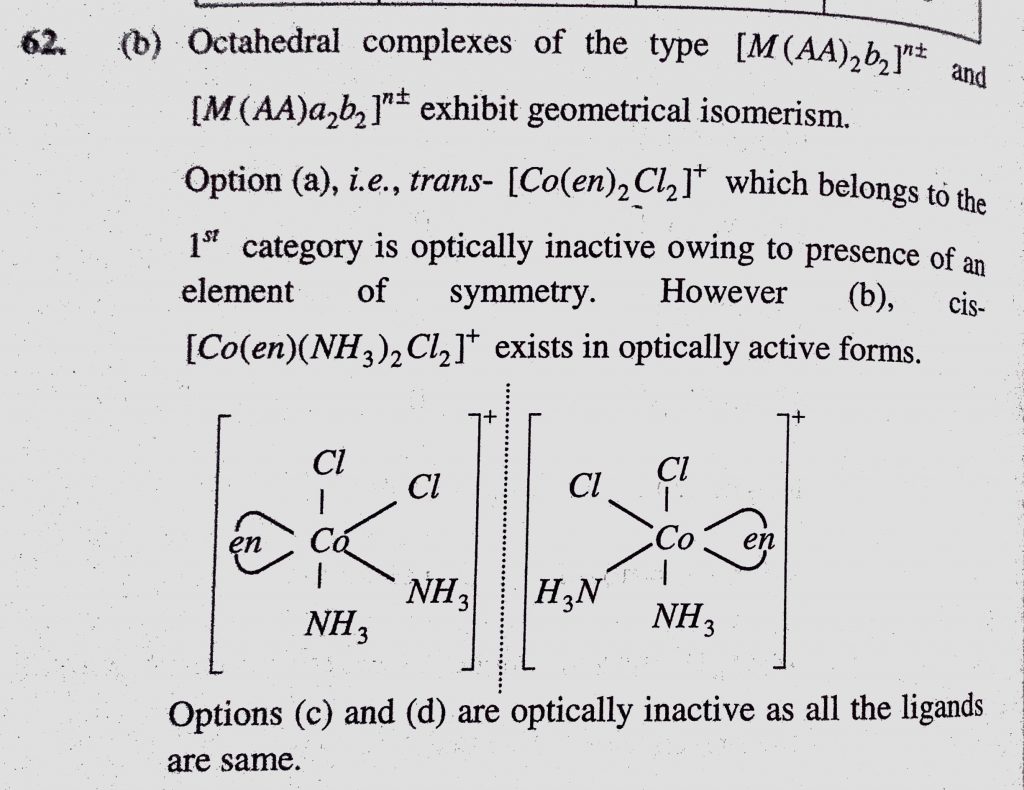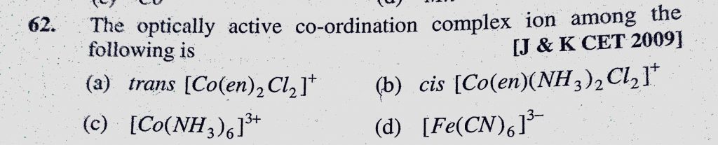 The optically active co-ordination complex ion among the following is (a) trans (Co(en)2Cl2) + (b) cis (Co(en)(NH3)2 Cl2 ) + The optically active co-ordination complex ion among the following is (a) trans (Co(en)2Cl2) + (b) cis (Co(en)(NH3)2 Cl2 ) + December 4, 2020 Category: Uncategorised (JEE Advanced Physics by BM Sharma + GMP Solutions) , Facebook Messenger WhatsApp Share this:TwitterFacebook Related