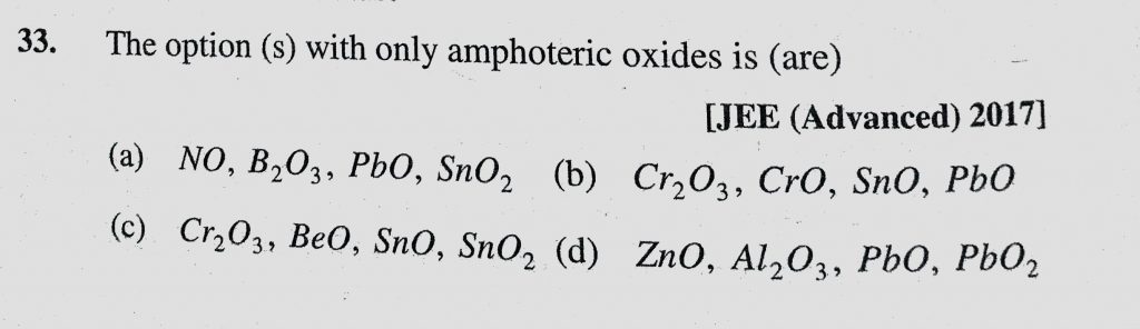 The option(s) with only amphoteric oxides is (are) (a) NO, B2O3, PbO, SnO2 (b) Cr2O3, CrO, SnO, PbO B2O3 CrO PbO SnO SnO2 (b) Cr2O3 The option(s) with only amphoteric oxides is (are) (a) NO November 29, 2020 Category: Uncategorised (JEE Advanced Physics by BM Sharma + GMP Solutions) , Facebook Messenger WhatsApp Share this:TwitterFacebook Related