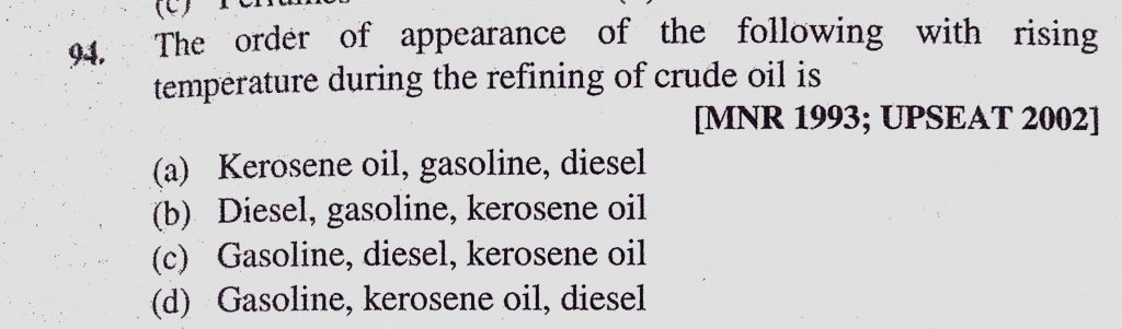 The order of appearance of the following with rising temperature during the refining of crude oil is (a) Kerosene oil, gasoline, diesel (b) Diesel, gasoline , Kerosene oil diesel (b) Diesel gasoline Kerosene oil The order of appearance of the following with rising temperature during the refining of crude oil is (a) Kerosene oil December 12, 2020 Category: Uncategorised (JEE Advanced Physics by BM Sharma + GMP Solutions) , Facebook Messenger WhatsApp Share this:TwitterFacebook Related