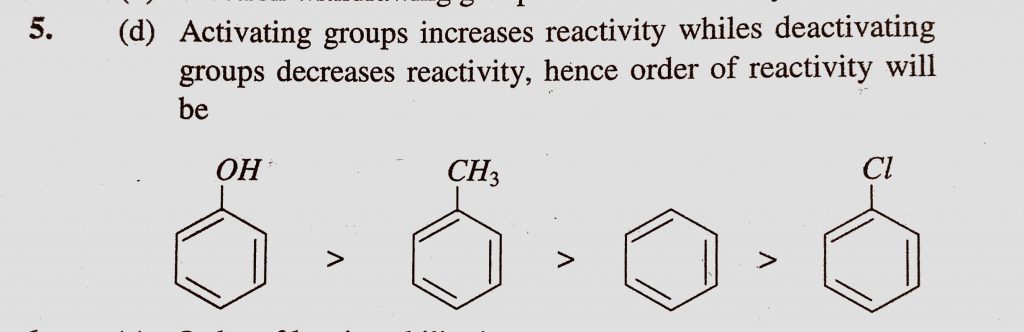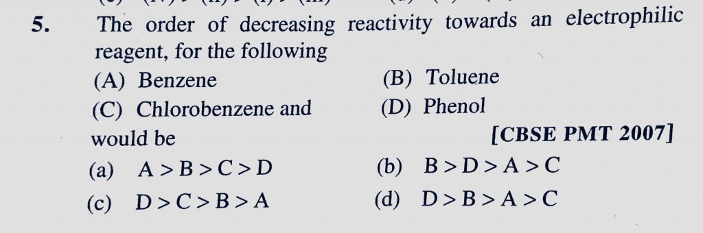 The order of decreasing reactivity towards an electrophilic reagent, for the following (A) Benzene (B) Toluene (C) Chlorobenzene and (D) Phenol would be for the following (A) Benzene (B) Toluene (C) Chlorobenzene and (D) Phenol would be The order of decreasing reactivity towards an electrophilic reagent December 9, 2020 Category: Uncategorised (JEE Advanced Physics by BM Sharma + GMP Solutions) , Facebook Messenger WhatsApp Share this:TwitterFacebook Related
