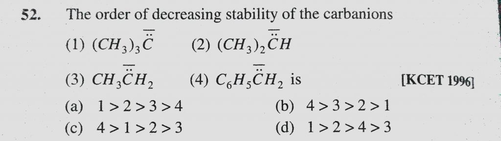 The order of decreasing stability of the carbanions (1) (CH3) C (2) (CH3)2CH (3) CH3CH2 (4) C6H5CH2 is The order of decreasing stability of the carbanions (1) (CH3) C (2) (CH3)2CH (3) CH3CH2 (4) C6H5CH2 is December 9, 2020 Category: Uncategorised (JEE Advanced Physics by BM Sharma + GMP Solutions) , Facebook Messenger WhatsApp Share this:TwitterFacebook Related