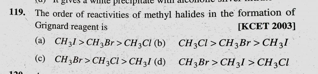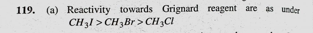 The order of reactivities of methyl halides in the formation of Grignard reagent is (a) CH3I > CH3Br > CH3Cl (b) CH3Cl > CH3Br > CH3I The order of reactivities of methyl halides in the formation of Grignard reagent is (a) CH3I > CH3Br > CH3Cl (b) CH3Cl > CH3Br > CH3I February 8, 2021 Category: Uncategorised (JEE Advanced Physics by BM Sharma + GMP Solutions) , Facebook Messenger WhatsApp Share this:TwitterFacebook Related
