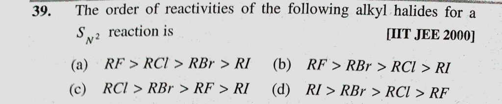 The order of reactivities of the following alkyl halides for a S N2 reaction is (a) RF > RCl > RBr > RI (b) RF > RBr > RCl > RI The order of reactivities of the following alkyl halides for a S N2 reaction is (a) RF > RCl > RBr > RI (b) RF > RBr > RCl > RI February 9, 2021 Category: Uncategorised (JEE Advanced Physics by BM Sharma + GMP Solutions) , Facebook Messenger WhatsApp Share this:TwitterFacebook Related