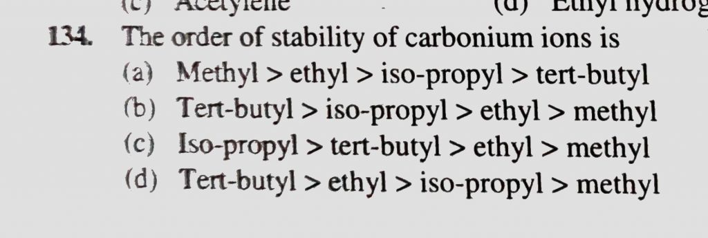 The order of stability of carbonium ions is (a) Methyl > ethyl > iso-propyl > tert – butyl (b) Tert-butyl > iso-propyl > ethyl > methyl The order of stability of carbonium ions is (a) Methyl > ethyl > iso-propyl > tert - butyl (b) Tert-butyl > iso-propyl > ethyl > methyl February 14, 2021 Category: Uncategorised (JEE Advanced Physics by BM Sharma + GMP Solutions) , Facebook Messenger WhatsApp Share this:TwitterFacebook Related