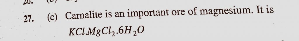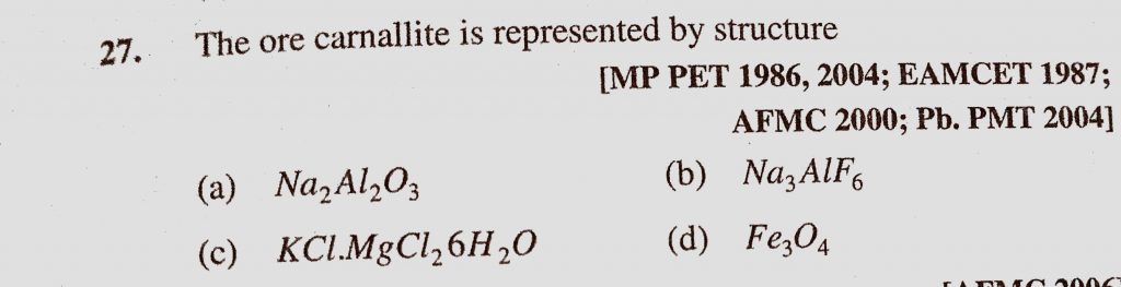The ore carnallite is represented by structure (a) Na2Al2O3 (b) Na3Alf6 (c) KCl. MgCl26H2O (d) Fe3O4 The ore carnallite is represented by structure (a) Na2Al2O3 (b) Na3Alf6 (c) KCl. MgCl26H2O (d) Fe3O4 November 11, 2020 Category: Uncategorised (JEE Advanced Physics by BM Sharma + GMP Solutions) , Facebook Messenger WhatsApp Share this:TwitterFacebook Related