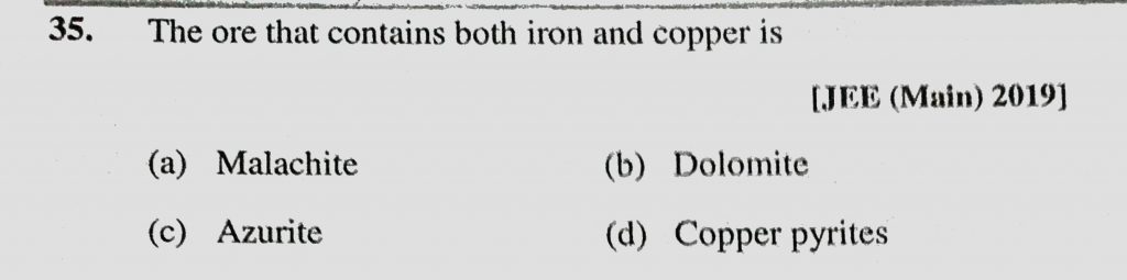 The ore that contains both iron and copper is (a) Malachite (b) Dolomite (c) Azurite (d) Copper pyrites The ore that contains both iron and copper is (a) Malachite (b) Dolomite (c) Azurite (d) Copper pyrites November 12, 2020 Category: Uncategorised (JEE Advanced Physics by BM Sharma + GMP Solutions) , Facebook Messenger WhatsApp Share this:TwitterFacebook Related