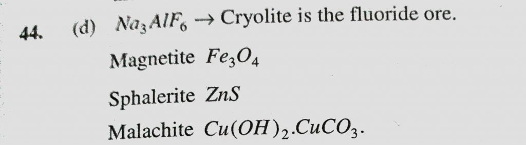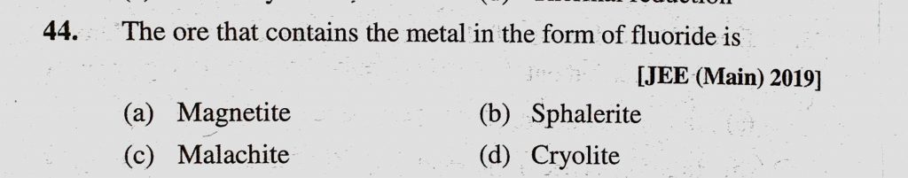The ore that contains the metal in the form of fluoride is (a) Magnetite (b) Sphalerite (c) Malachite (d) Cryolite The ore that contains the metal in the form of fluoride is (a) Magnetite (b) Sphalerite (c) Malachite (d) Cryolite November 12, 2020 Category: Uncategorised (JEE Advanced Physics by BM Sharma + GMP Solutions) , Facebook Messenger WhatsApp Share this:TwitterFacebook Related