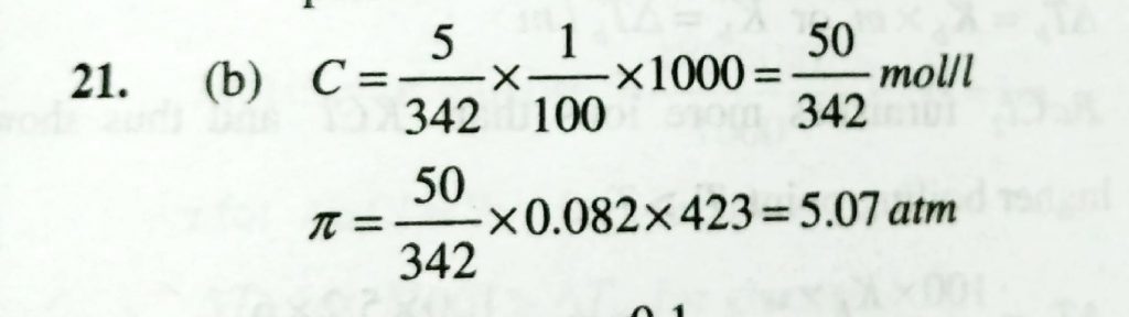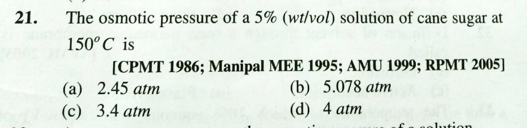 The osmotic pressure of a 5% ( wt/vol ) solution of cane sugar at 150 degree C is (a) 2.45 atm (b) 5.078 atm (c) 3.4 atm (d) 4 atm The osmotic pressure of a 5% ( wt/vol ) solution of cane sugar at 150 degree C is (a) 2.45 atm (b) 5.078 atm (c) 3.4 atm (d) 4 atm December 13, 2020 Category: Uncategorised (JEE Advanced Physics by BM Sharma + GMP Solutions) , Facebook Messenger WhatsApp Share this:TwitterFacebook Related