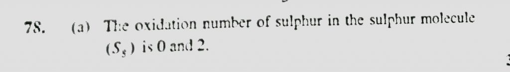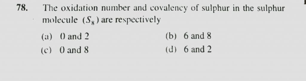 The oxidation number and covalency of sulphur in the sulphur molecule (S8 ) are respectively The oxidation number and covalency of sulphur in the sulphur molecule (S8 ) are respectively November 24, 2020 Category: Uncategorised (JEE Advanced Physics by BM Sharma + GMP Solutions) , Facebook Messenger WhatsApp Share this:TwitterFacebook Related