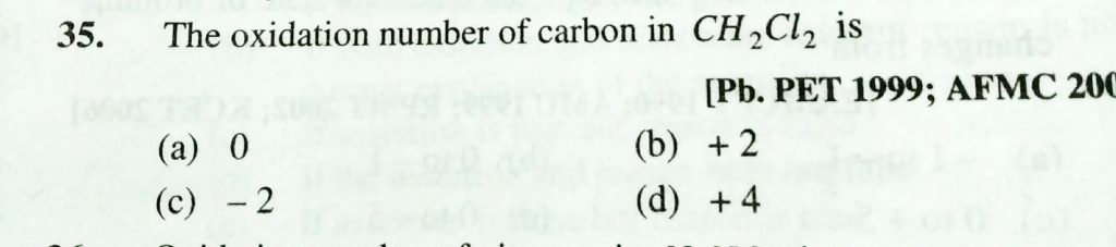 THe oxidation number of carbon in CH2Cl2 is (a) 0 (b) +2 (c) -2 (d) +4 THe oxidation number of carbon in CH2Cl2 is (a) 0 (b) +2 (c) -2 (d) +4 November 24, 2020 Category: Uncategorised (JEE Advanced Physics by BM Sharma + GMP Solutions) , Facebook Messenger WhatsApp Share this:TwitterFacebook Related