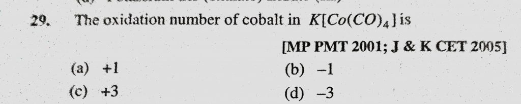 The oxidation number of cobalt in K(Co(CO)4) is (a) +1 (b) -1 (c) +3 (d) -3 The oxidation number of cobalt in K(Co(CO)4) is (a) +1 (b) -1 (c) +3 (d) -3 December 4, 2020 Category: Uncategorised (JEE Advanced Physics by BM Sharma + GMP Solutions) , Facebook Messenger WhatsApp Share this:TwitterFacebook Related
