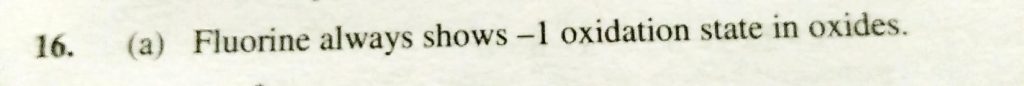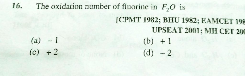 The oxidation number of fluorine in F2O is (a) -1 (b) +1 (c) +2 (d) -2 The oxidation number of fluorine in F2O is (a) -1 (b) +1 (c) +2 (d) -2 November 23, 2020 Category: Uncategorised (JEE Advanced Physics by BM Sharma + GMP Solutions) , Facebook Messenger WhatsApp Share this:TwitterFacebook Related