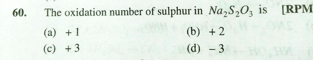 The oxidation number of sulphur in Na2S2O3 is (a) +1 (b) +2 (c) +3 (d) -3 The oxidation number of sulphur in Na2S2O3 is (a) +1 (b) +2 (c) +3 (d) -3 November 24, 2020 Category: Uncategorised (JEE Advanced Physics by BM Sharma + GMP Solutions) , Facebook Messenger WhatsApp Share this:TwitterFacebook Related