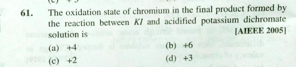 The oxidation state of chromium in the final product formed by the reaction between KI and acidified potassium dichromate solution is The oxidation state of chromium in the final product formed by the reaction between KI and acidified potassium dichromate solution is November 24, 2020 Category: Uncategorised (JEE Advanced Physics by BM Sharma + GMP Solutions) , Facebook Messenger WhatsApp Share this:TwitterFacebook Related