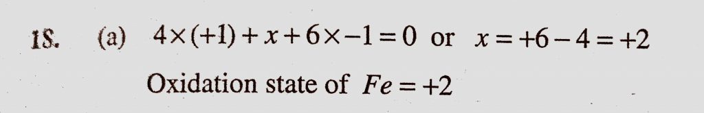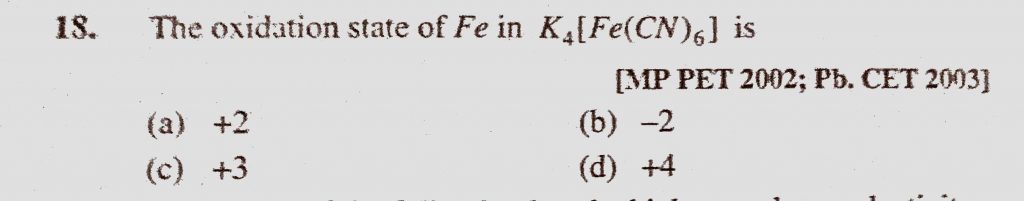The oxidation state of Fe in K4(Fe(CN)6) is (a) +2 (b) -2 (c) +3 (d) +4 The oxidation state of Fe in K4(Fe(CN)6) is (a) +2 (b) -2 (c) +3 (d) +4 December 3, 2020 Category: Uncategorised (JEE Advanced Physics by BM Sharma + GMP Solutions) , Facebook Messenger WhatsApp Share this:TwitterFacebook Related
