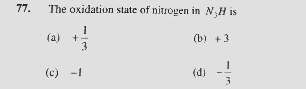 The oxidation state of nitrogen in N3H is (a) +1/3 (b) +3 (c) -1 (d) -1/3 The oxidation state of nitrogen in N3H is (a) +1/3 (b) +3 (c) -1 (d) -1/3 November 24, 2020 Category: Uncategorised (JEE Advanced Physics by BM Sharma + GMP Solutions) , Facebook Messenger WhatsApp Share this:TwitterFacebook Related