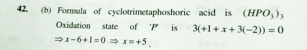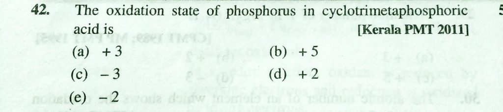 The oxidation state of phosphorous in cyclometaphosphoric acid is (a) +3 (b) +5 (c) -3 (d) +2 (e) -2 The oxidation state of phosphorous in cyclometaphosphoric acid is (a) +3 (b) +5 (c) -3 (d) +2 (e) -2 November 24, 2020 Category: Uncategorised (JEE Advanced Physics by BM Sharma + GMP Solutions) , Facebook Messenger WhatsApp Share this:TwitterFacebook Related