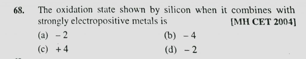 The oxidation state shown by silicon when it combines with strongly electropositive metals is The oxidation state shown by silicon when it combines with strongly electropositive metals is November 24, 2020 Category: Uncategorised (JEE Advanced Physics by BM Sharma + GMP Solutions) , Facebook Messenger WhatsApp Share this:TwitterFacebook Related