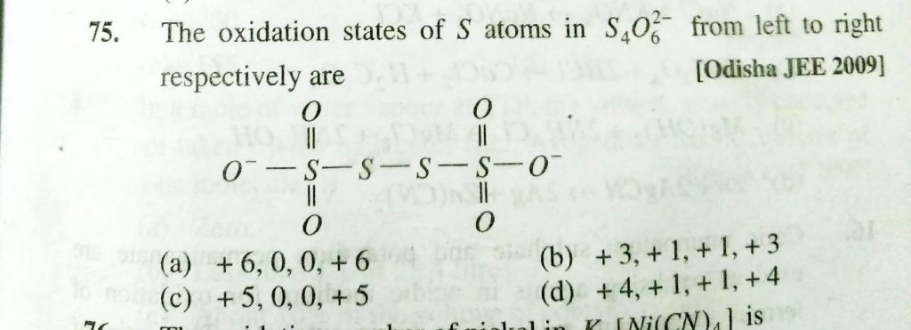 The oxidation states of S atoms in S4O6^2-from left to right respectively are The oxidation states of S atoms in S4O6^2-from left to right respectively are November 24, 2020 Category: Uncategorised (JEE Advanced Physics by BM Sharma + GMP Solutions) , Facebook Messenger WhatsApp Share this:TwitterFacebook Related