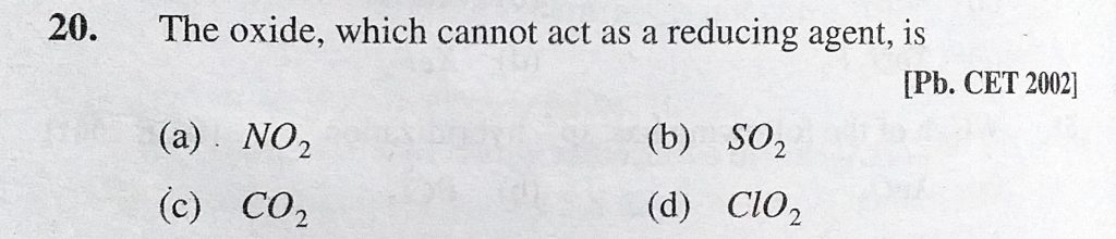 The oxide, which cannot act as a reducing agent, is (a) NO2 (b) SO2 (c) CO2 (d) ClO2 is (a) NO2 (b) SO2 (c) CO2 (d) ClO2 The oxide which cannot act as a reducing agent November 25, 2020 Category: Uncategorised (JEE Advanced Physics by BM Sharma + GMP Solutions) , Facebook Messenger WhatsApp Share this:TwitterFacebook Related