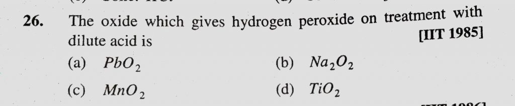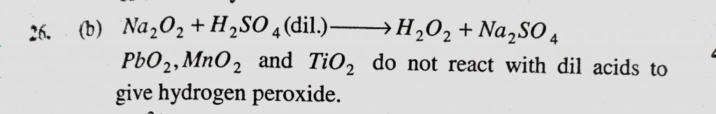 The oxide which gives hydrogen peroxide on treatment with dilute acid is (a) PbO2 (b) Na2O2 (c) MnO2 (d) TiO2 The oxide which gives hydrogen peroxide on treatment with dilute acid is (a) PbO2 (b) Na2O2 (c) MnO2 (d) TiO2 December 2, 2020 Category: Uncategorised (JEE Advanced Physics by BM Sharma + GMP Solutions) , Facebook Messenger WhatsApp Share this:TwitterFacebook Related