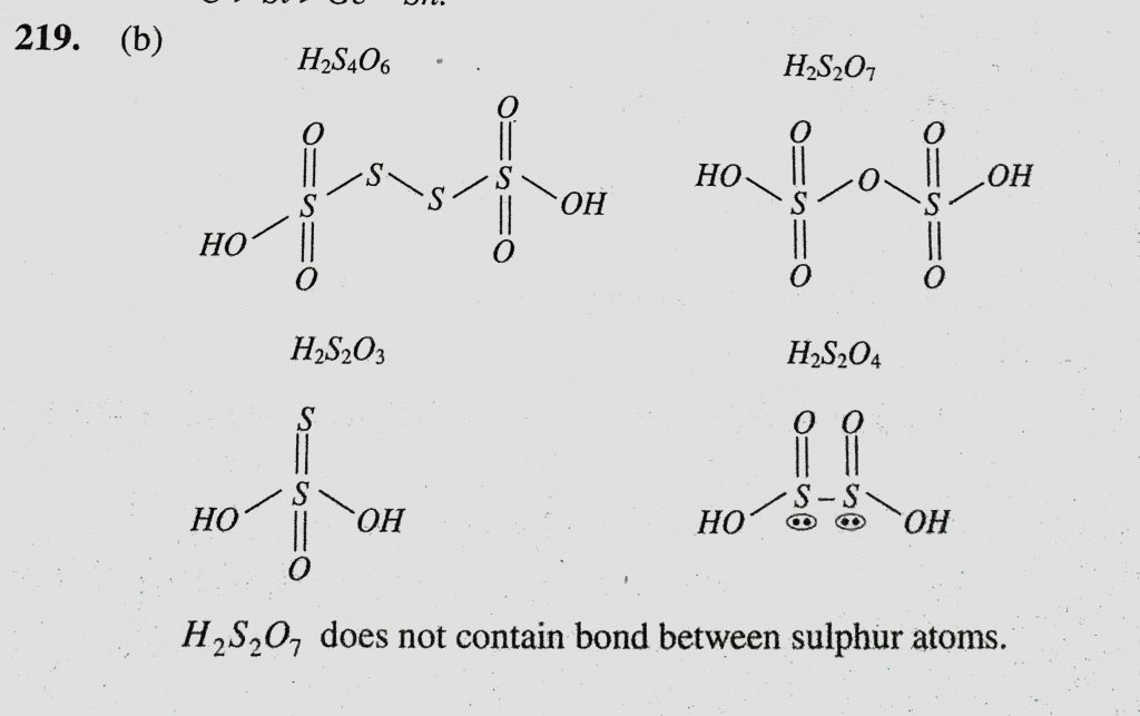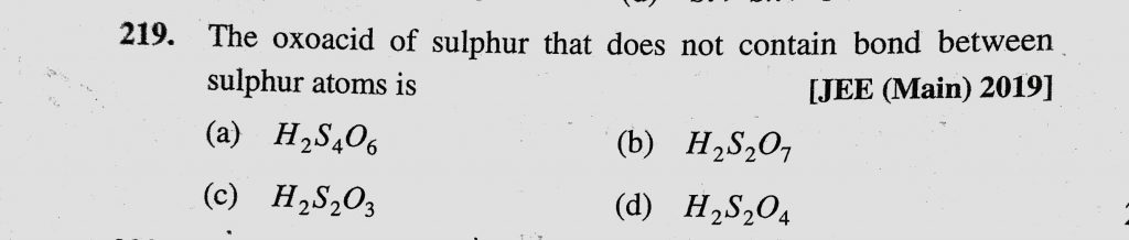The oxoacid of sulphur that does not contain bond between sulphur atoms is (a) H2S4O6 (b) H2S2O7 (c) H2S2O3 The oxoacid of sulphur that does not contain bond between sulphur atoms is (a) H2S4O6 (b) H2S2O7 (c) H2S2O3 November 28, 2020 Category: Uncategorised (JEE Advanced Physics by BM Sharma + GMP Solutions) , Facebook Messenger WhatsApp Share this:TwitterFacebook Related