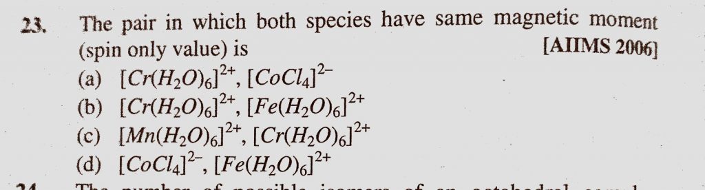 The pair in which both species have same magnetic moment (spin only value) is (a) (Cr(H2O)6)2+, (CoCl4) 2- (CoCl4) 2- The pair in which both species have same magnetic moment (spin only value) is (a) (Cr(H2O)6)2+ December 4, 2020 Category: Uncategorised (JEE Advanced Physics by BM Sharma + GMP Solutions) , Facebook Messenger WhatsApp Share this:TwitterFacebook Related