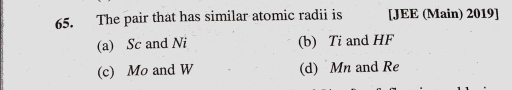 The pair that has similar atomic radii is (a) Sc and Ni (b) Ti and HF (c) Mo and W (d) Mn and Re The pair that has similar atomic radii is (a) Sc and Ni (b) Ti and HF (c) Mo and W (d) Mn and Re November 11, 2020 Category: Uncategorised (JEE Advanced Physics by BM Sharma + GMP Solutions) , Facebook Messenger WhatsApp Share this:TwitterFacebook Related