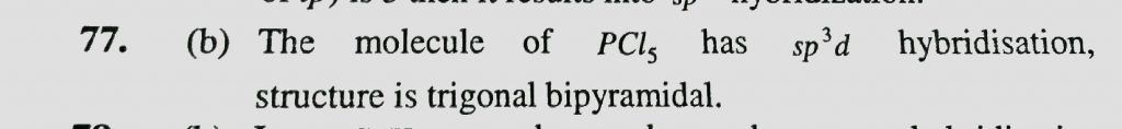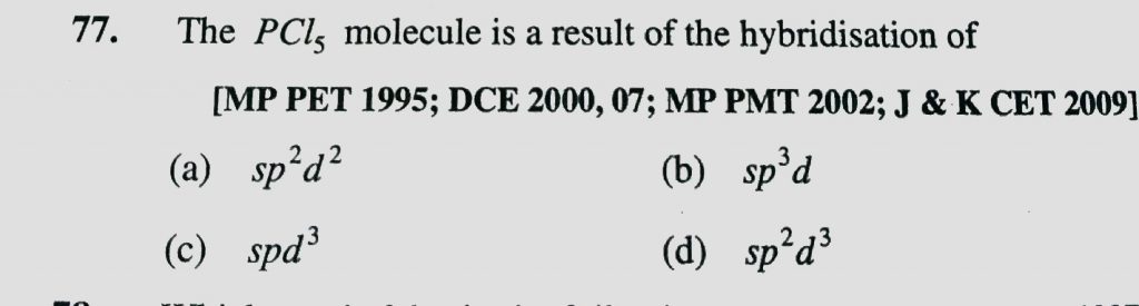 The PCL5 molecule is a result of the hybridisation of (a) sp^2d^2 (b) sp^3d (c) spd^3 (d) sp^2d^3 The PCL5 molecule is a result of the hybridisation of (a) sp^2d^2 (b) sp^3d (c) spd^3 (d) sp^2d^3 December 6, 2020 Category: Uncategorised (JEE Advanced Physics by BM Sharma + GMP Solutions) , Facebook Messenger WhatsApp Share this:TwitterFacebook Related